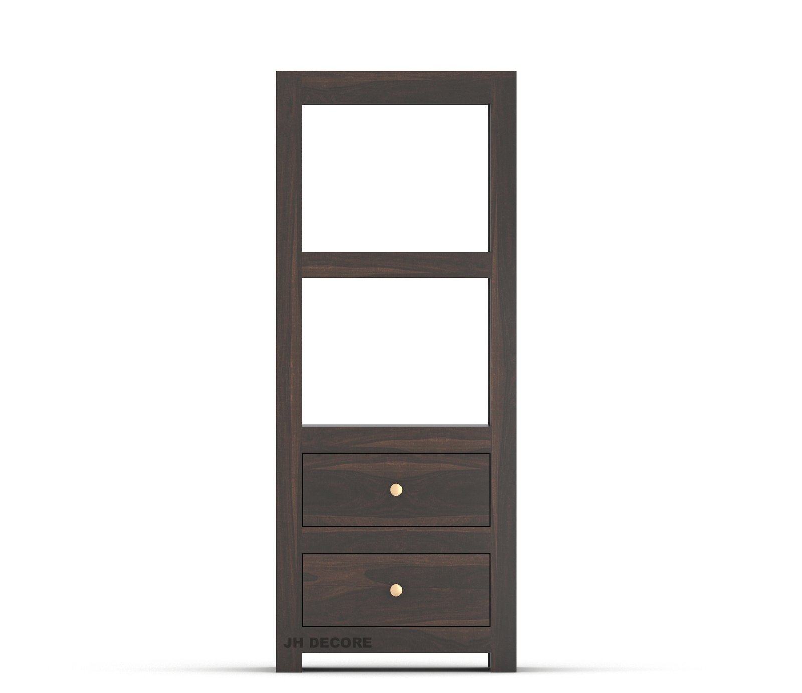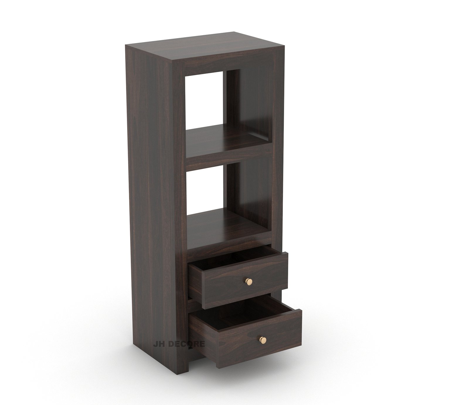 Smooth drawers, heavy-duty build, multiple open shelves, space-saving vertical design |